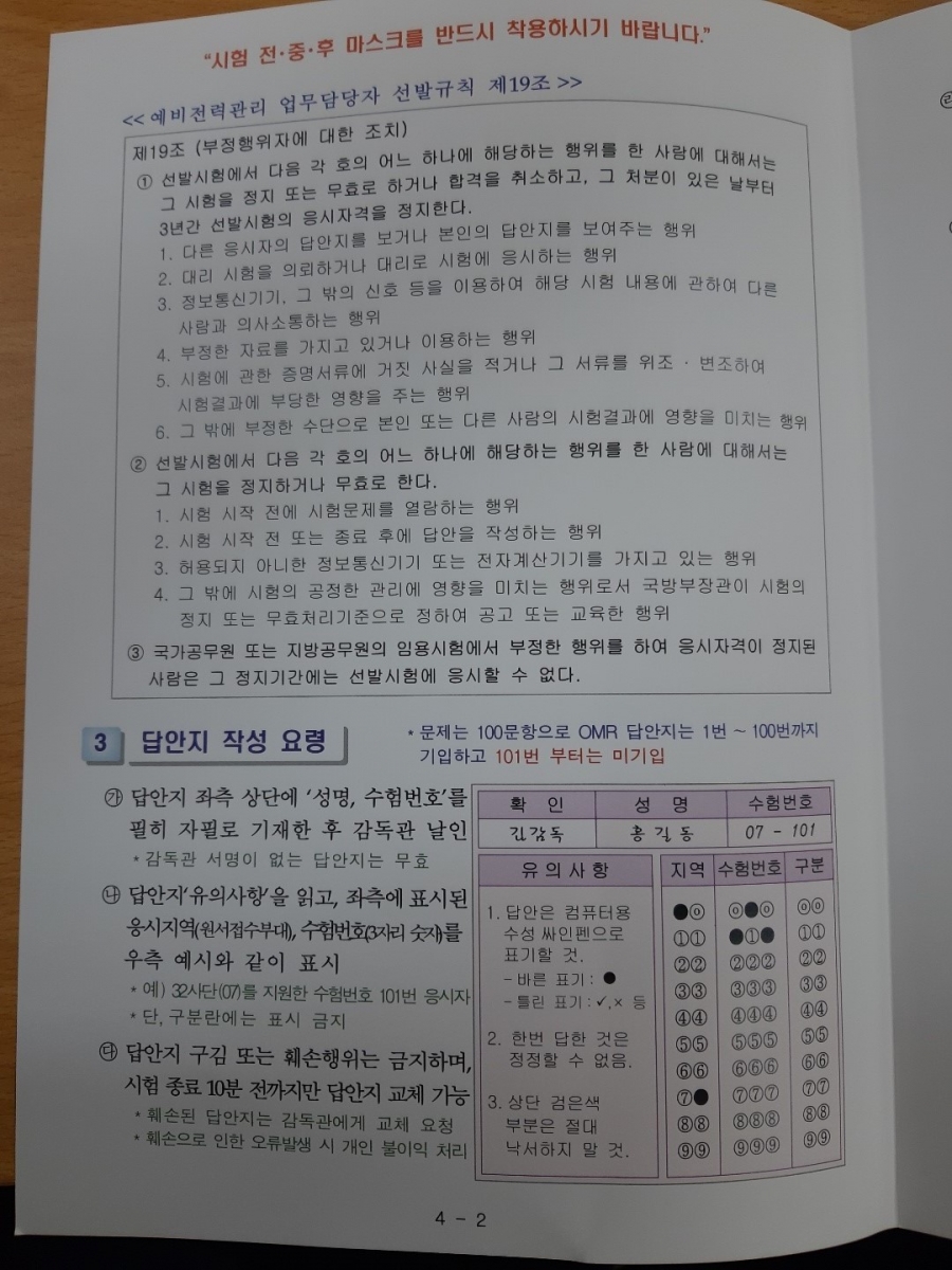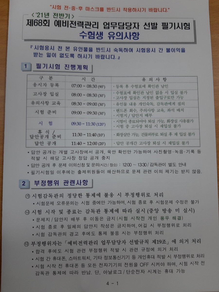 21년 전반기 68회 예비전력업무담당자 시험 유의사항 참고