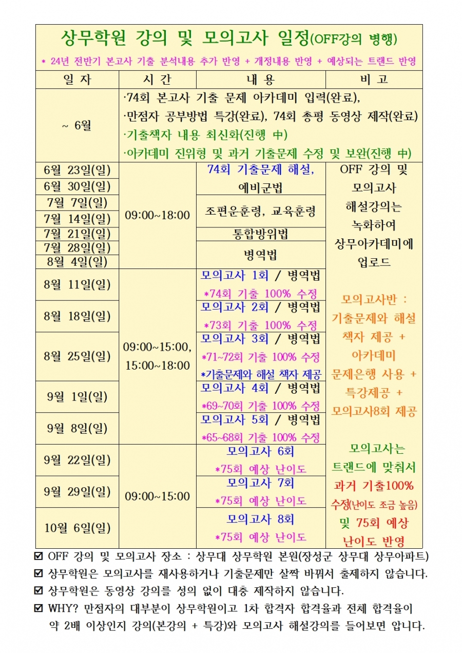 녹화 강의 일정 및 75회(24년 후반) 모의고사 일정 재공지