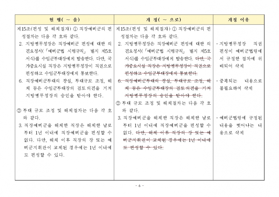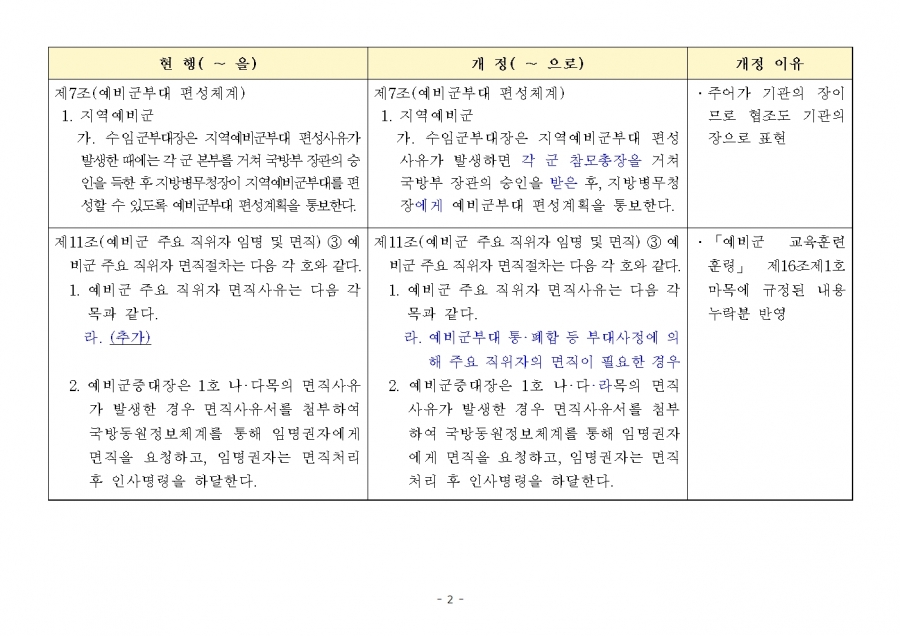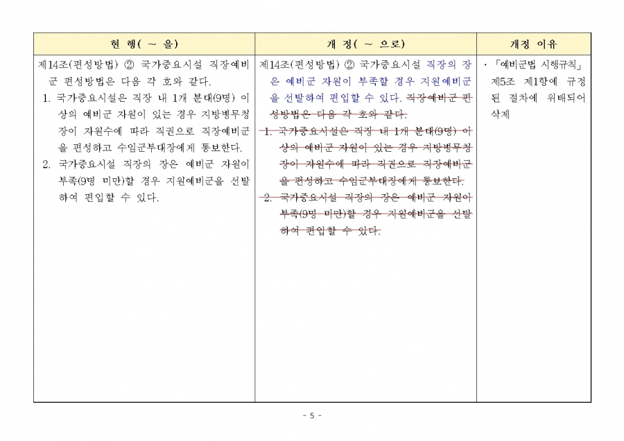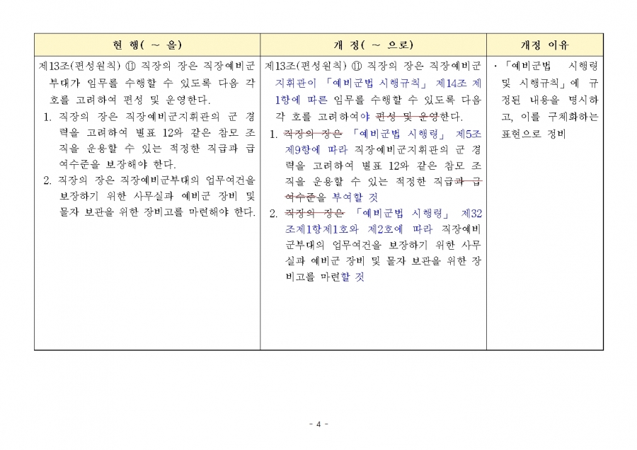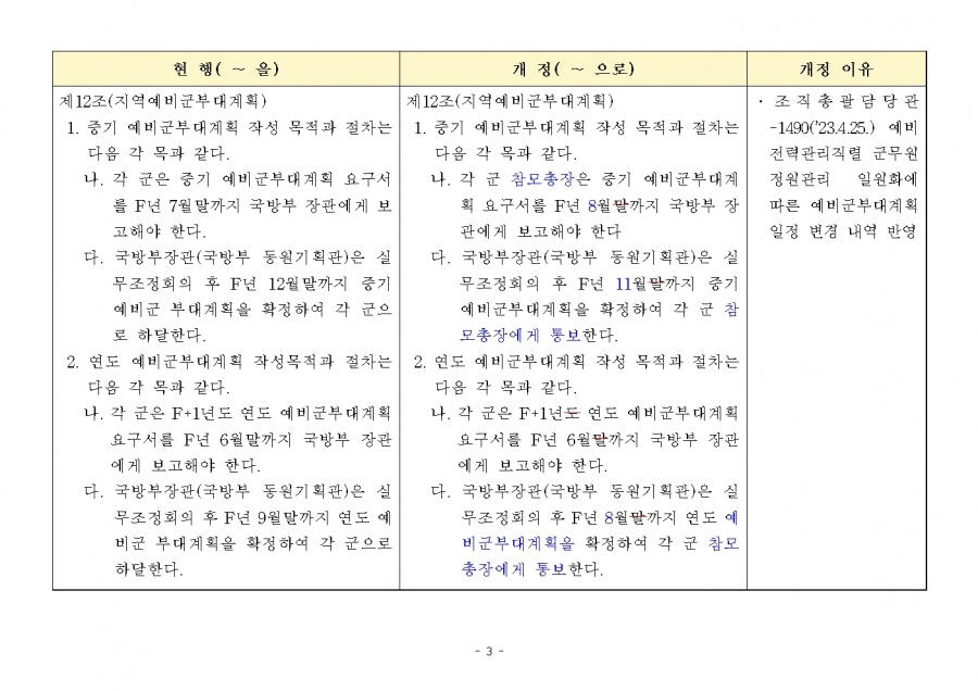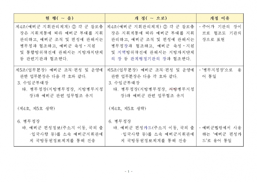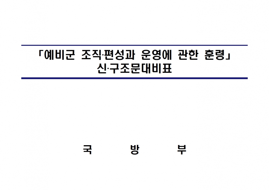 예비군 조직‧편성과 운영에 관한 훈령 개정 및 시행(24년 1월 19일부, 24년 전반기부터 적용) 신구조문대비표 사진