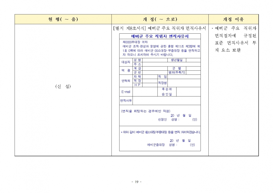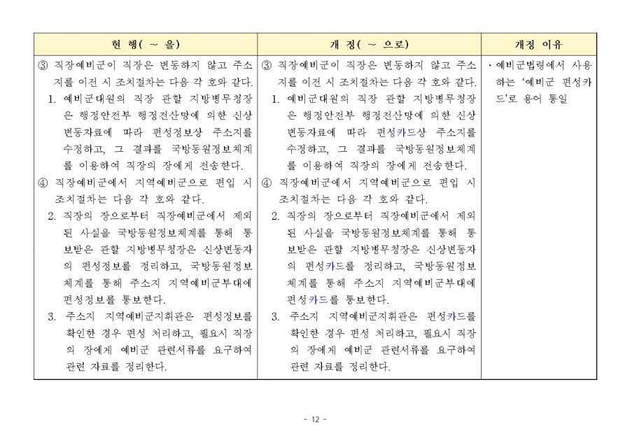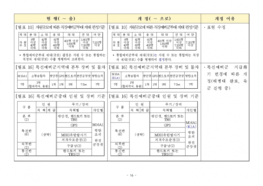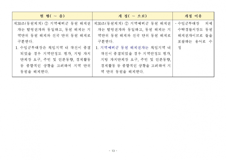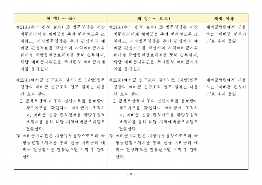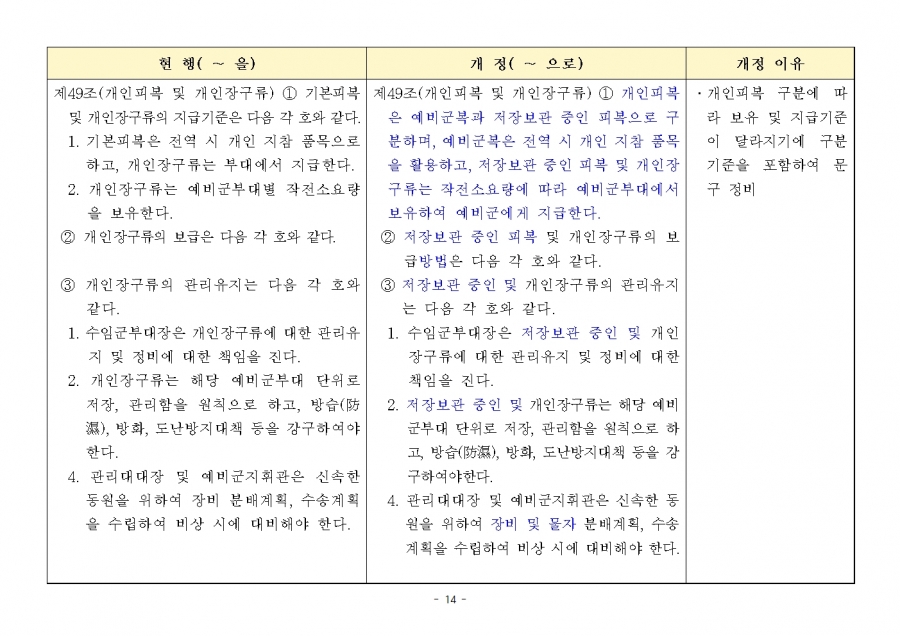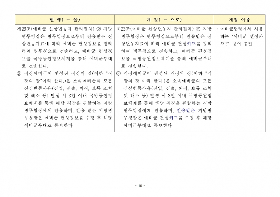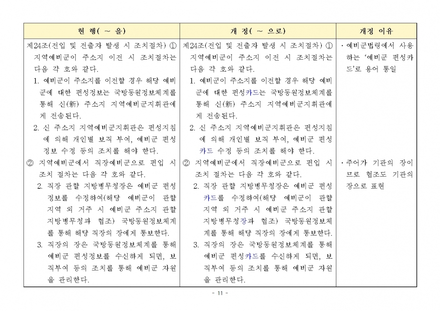 예비군 조직‧편성과 운영에 관한 훈령 개정 및 시행(24년 1월 19일부, 24년 전반기부터 적용) 신구조문대비표 사진