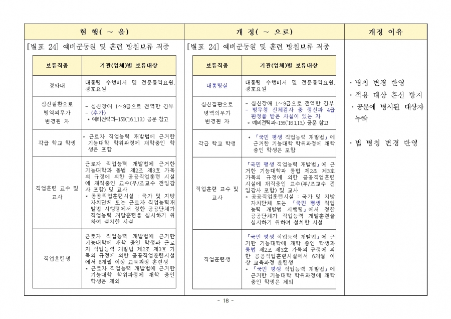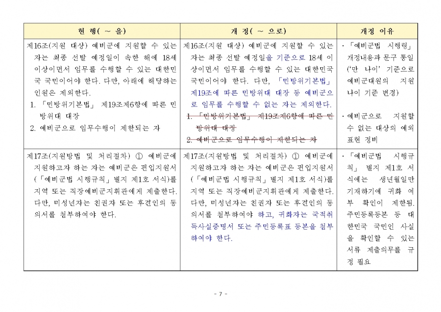 병역법 시행령 및 조편운훈령 수정