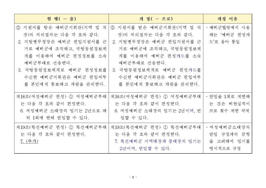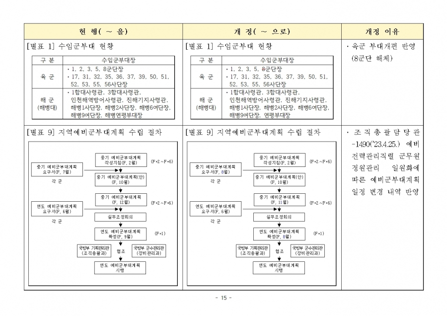 예비군 조직‧편성과 운영에 관한 훈령 개정 및 시행(24년 1월 19일부, 24년 전반기부터 적용)…