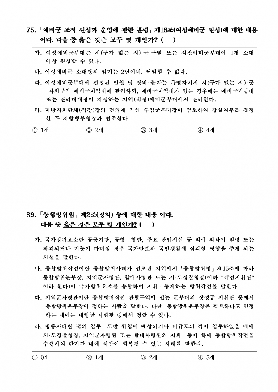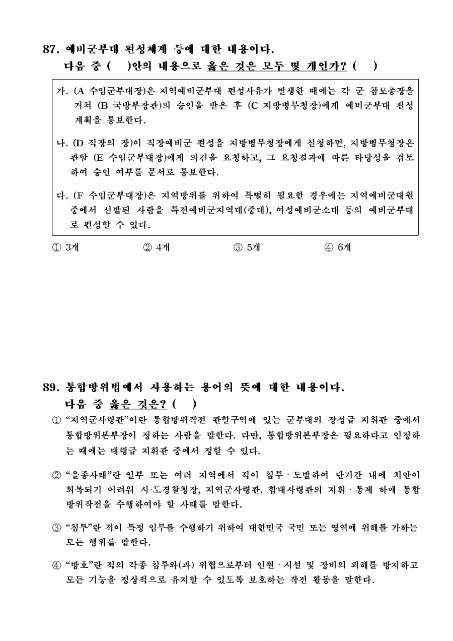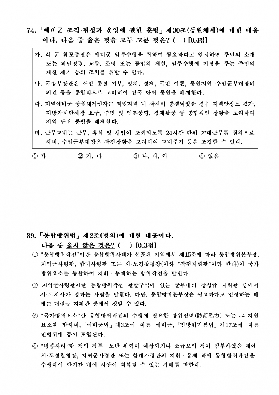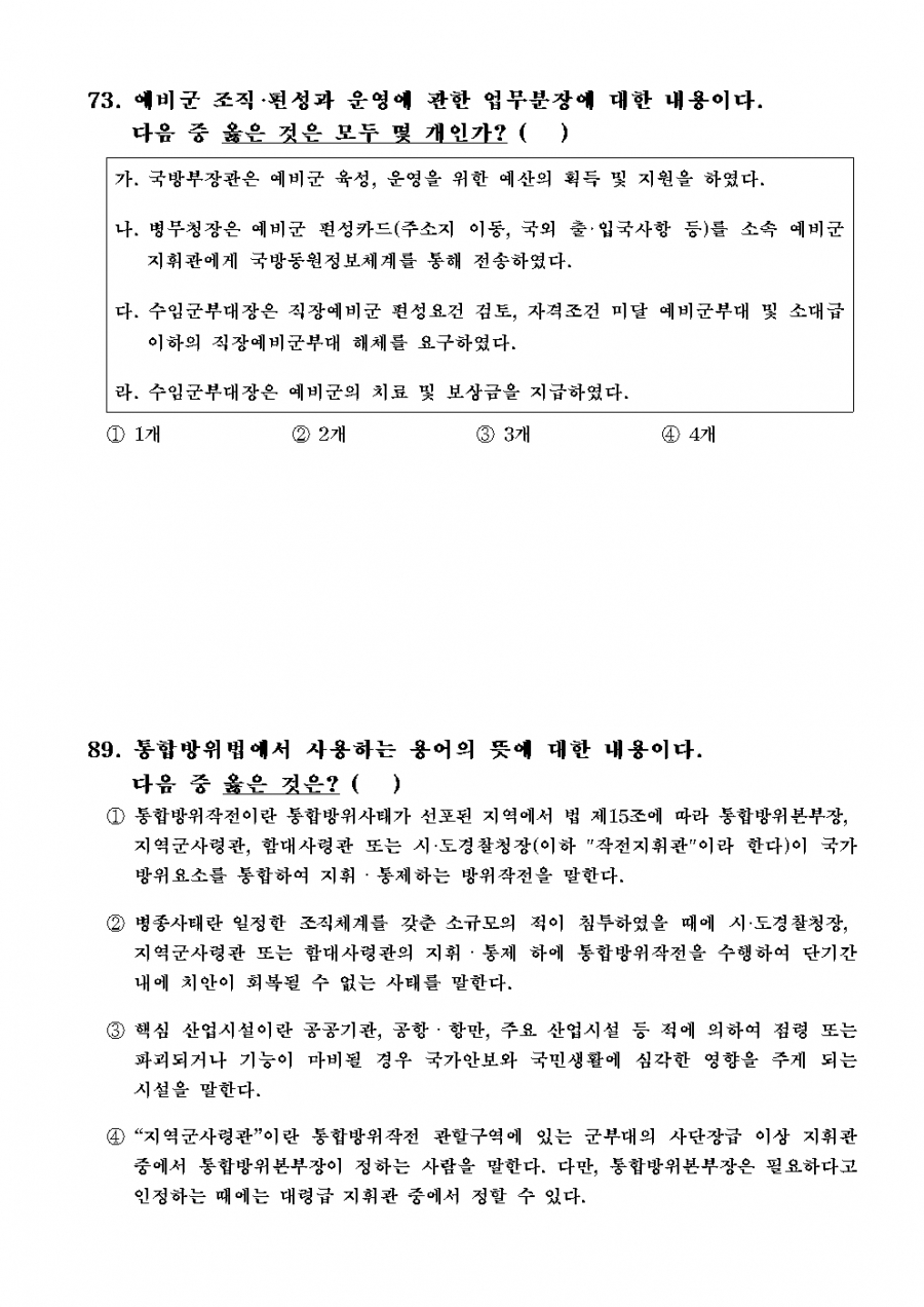 예비군훈령 및 통합방위법 개정에 따른 기출 제본책자 수정 내용(문제 사진)