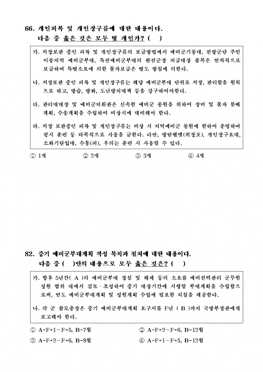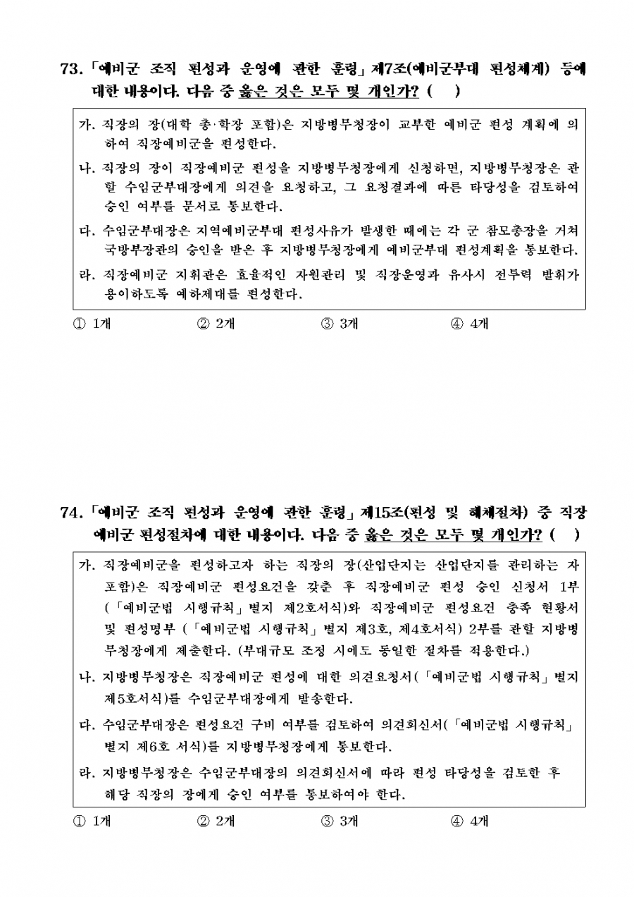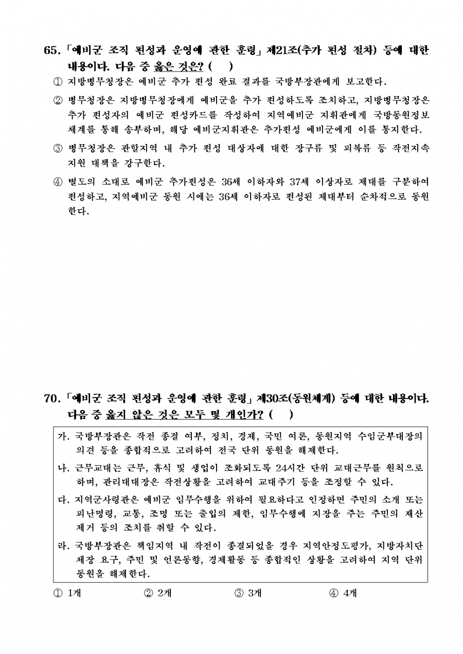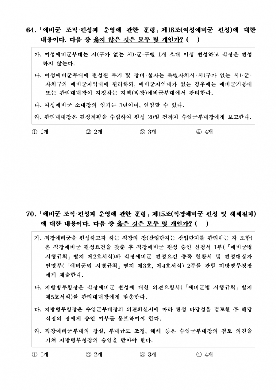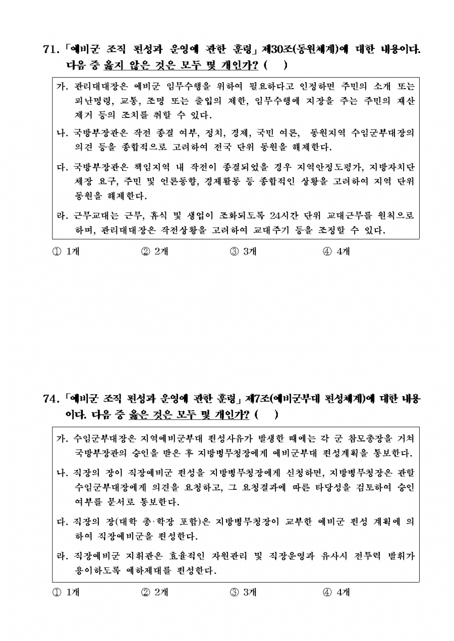 예비군훈령 및 통합방위법 개정에 따른 기출 제본책자 수정 내용(문제 사진)