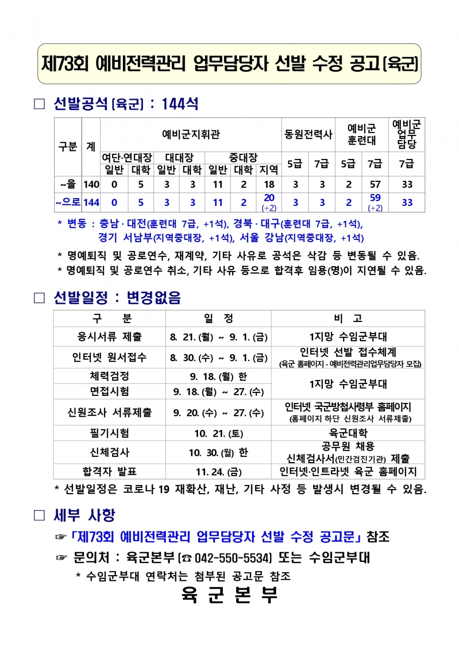 73회 예비전력관리 업무담당자 선발 수정공고(육군)