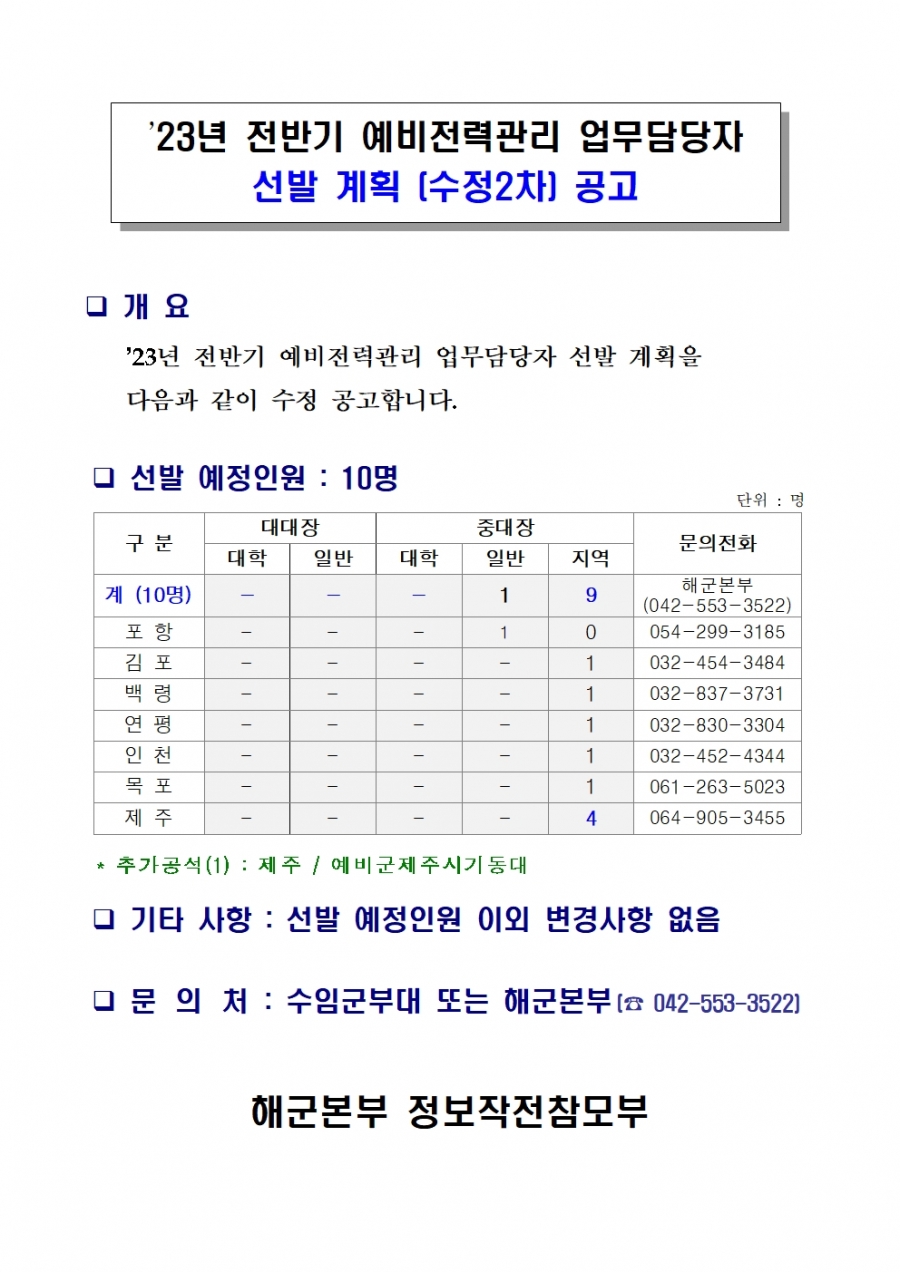 23년 전반기 예비전력관리 업무담당자 수정공고2차 해군