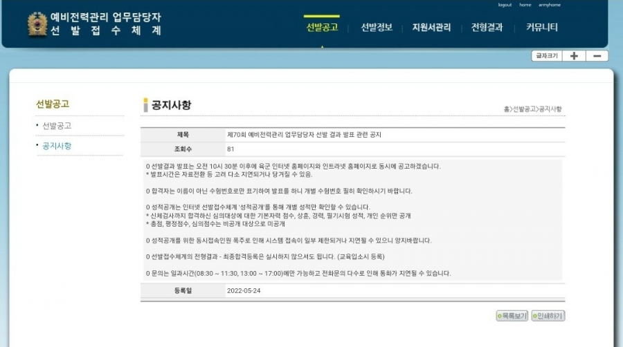 70회 육군 예비전력관리 업무담당자 합격자 선발결과