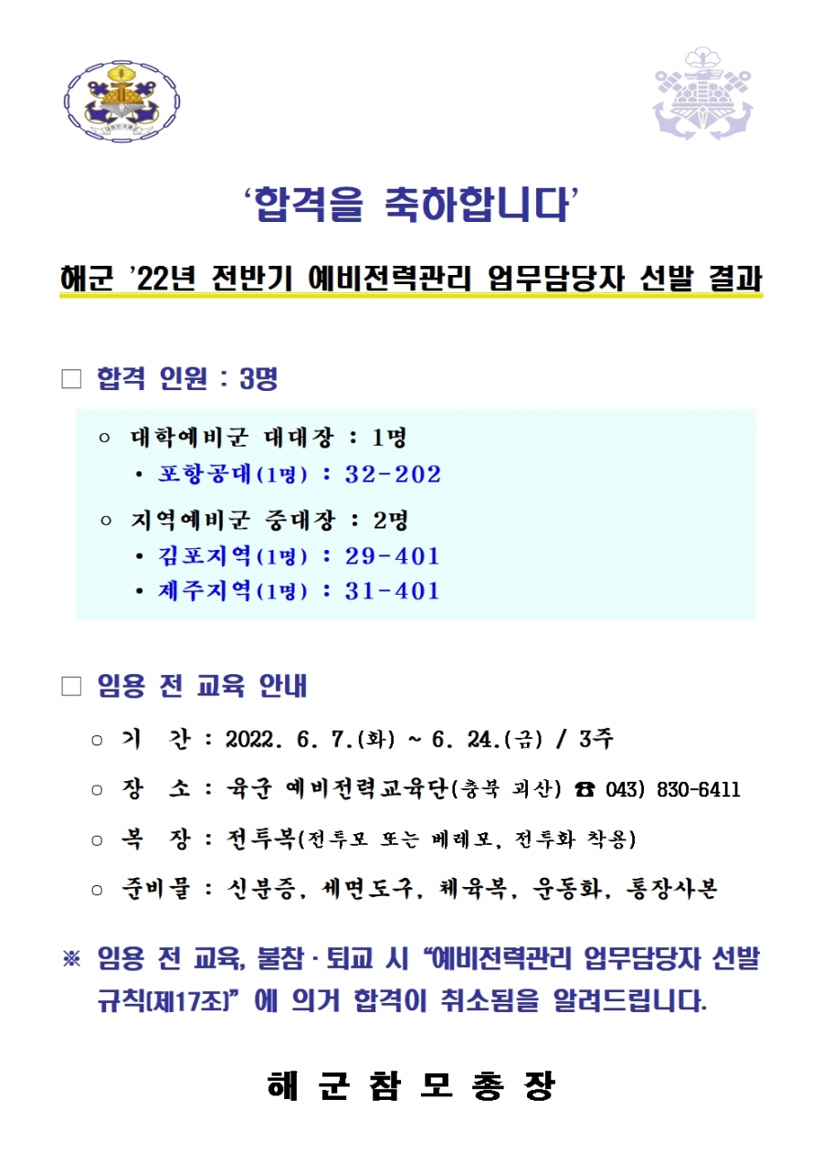 70회 해군 예비전력업무담당자 최종 합격자 선발 결과