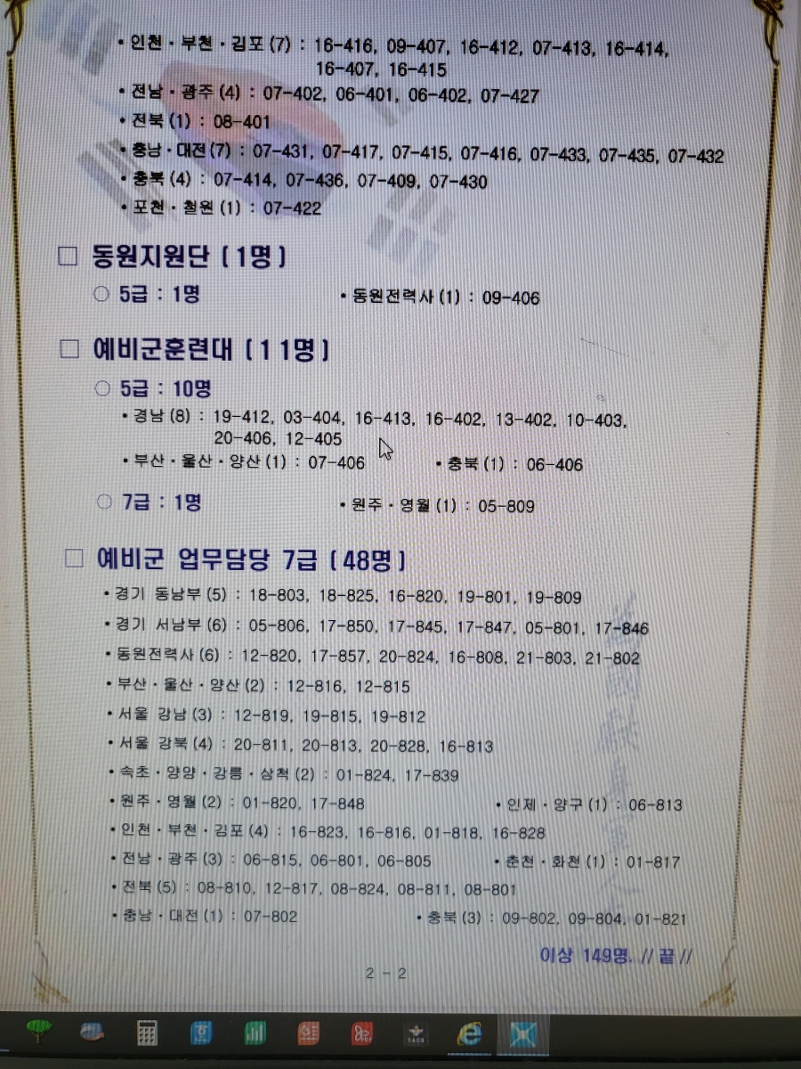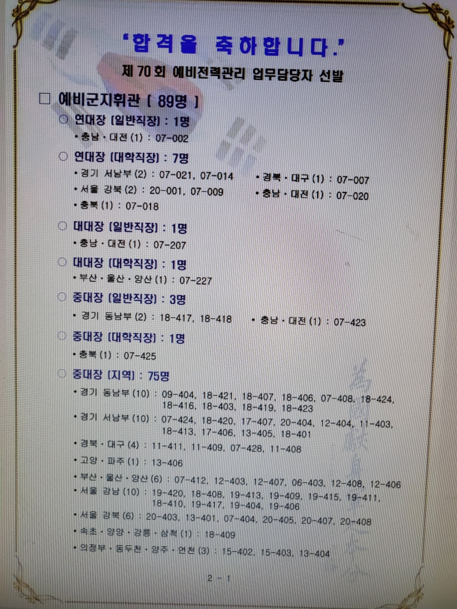 70회 육군 예비전력관리 업무담당자 합격자 선발결과