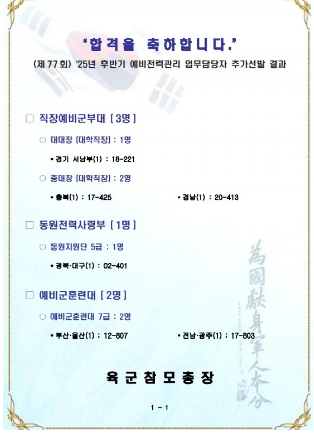 예비전력업무담당자(77회) 추가 합격자(육군)