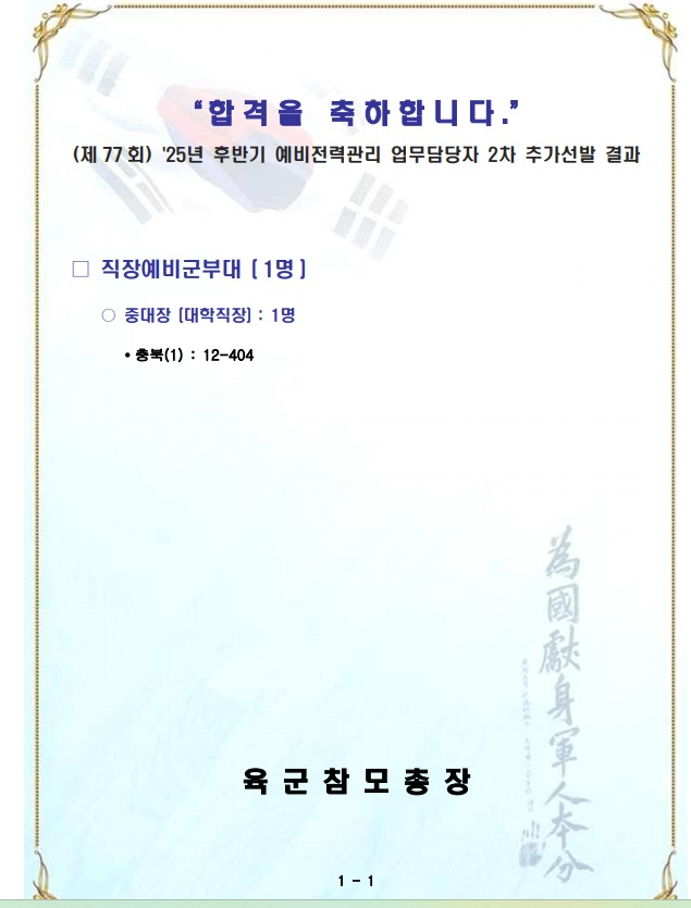 예비전력업무담당자(77회) 추가 합격자(육군)