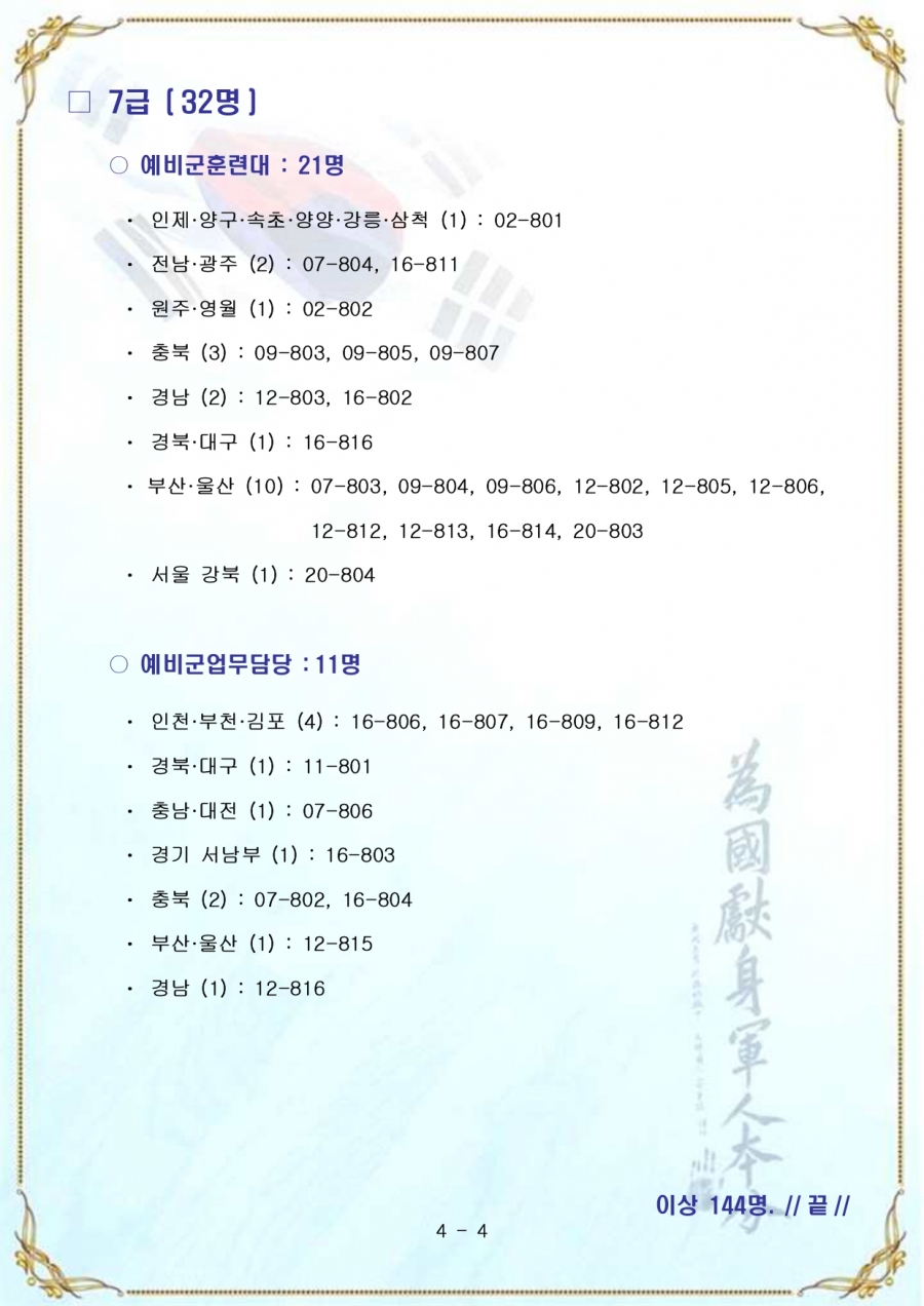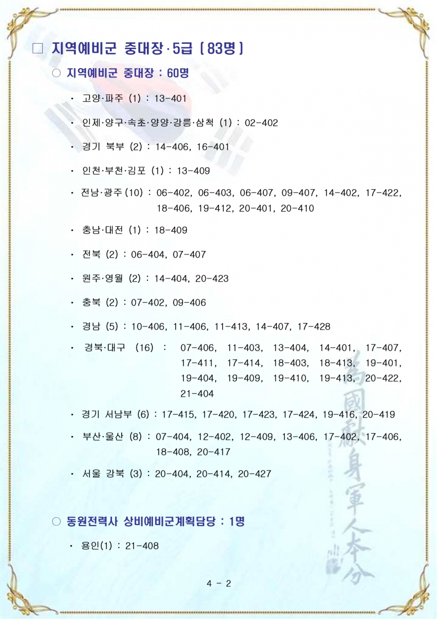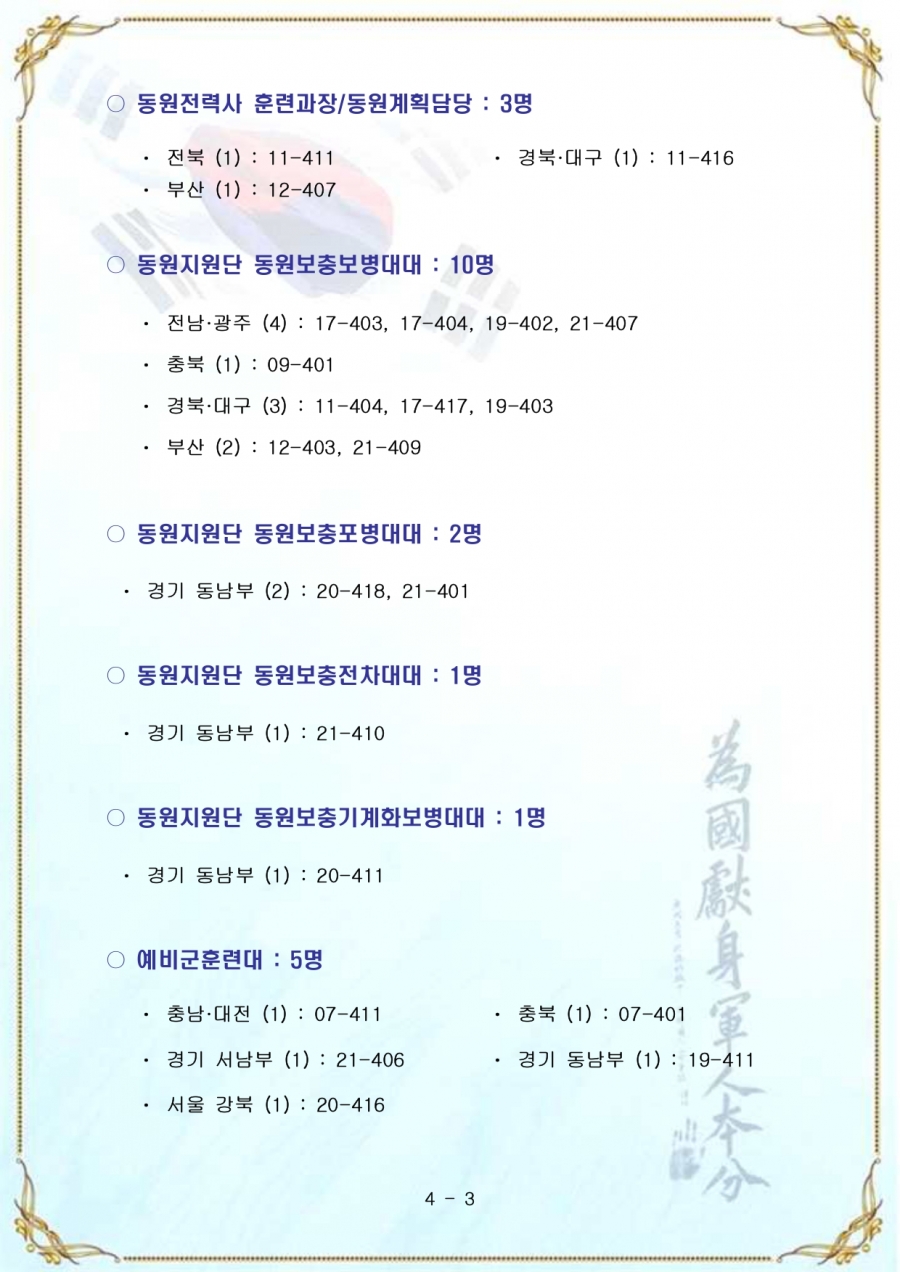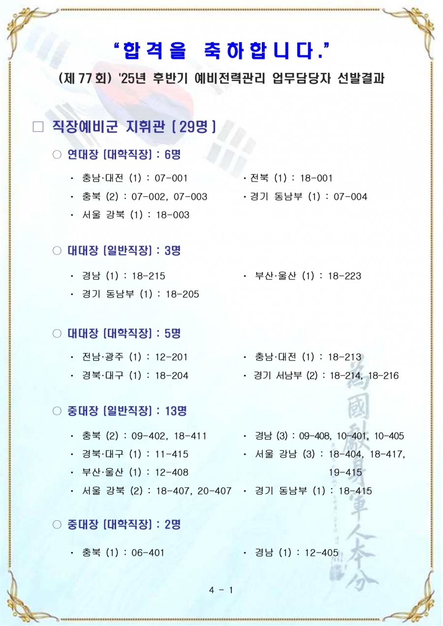 예비전력업무담당자(77회) 추가 합격자(육군)