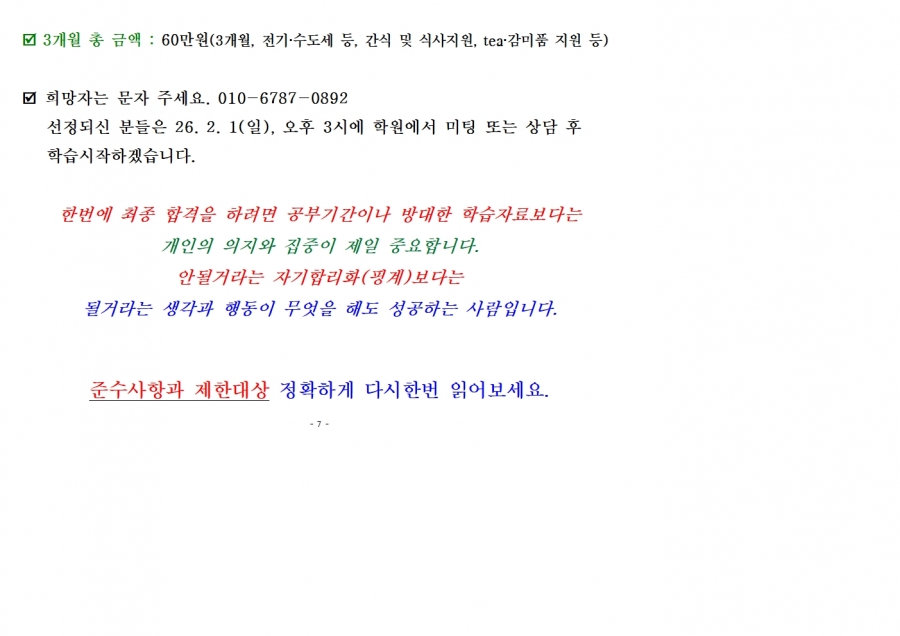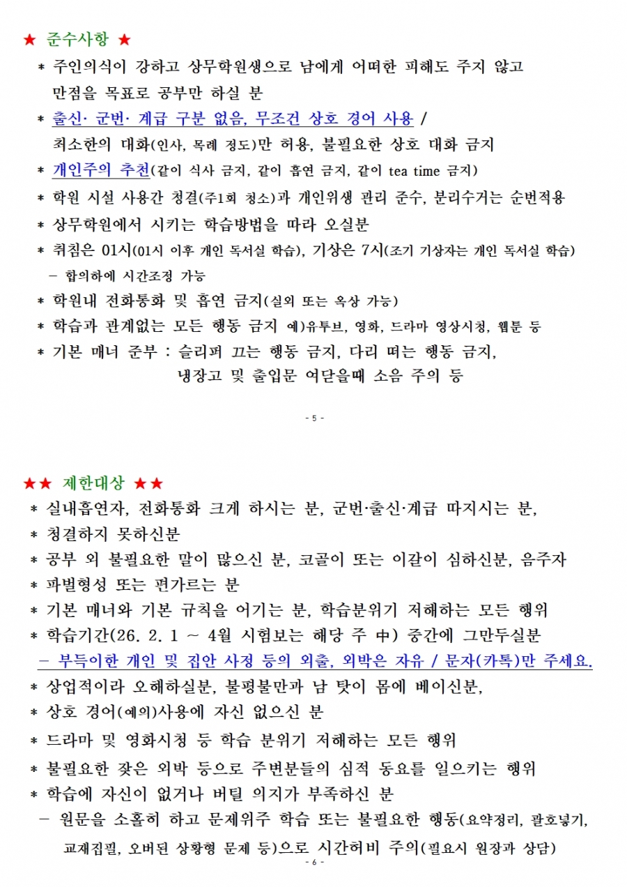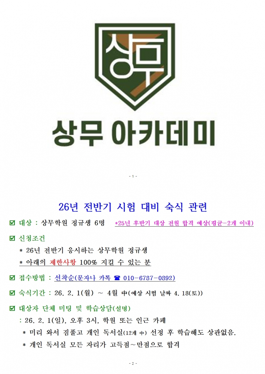 26년 전반기(78회)대비 상무학원 숙식인원 선착순 신청접수