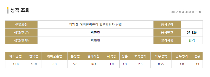 - 필기 결과 : 36.1점(예비군법 -5개, 훈령 -4개)